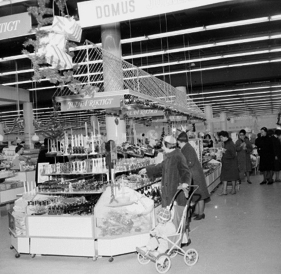 Konsum Domus, affärsinteriör, kunder och personal. Juldisk.