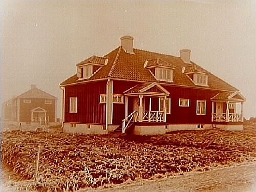 En och en halvvånings bostadshus med takhuvar, förstebro, tvåfamiljs hus.