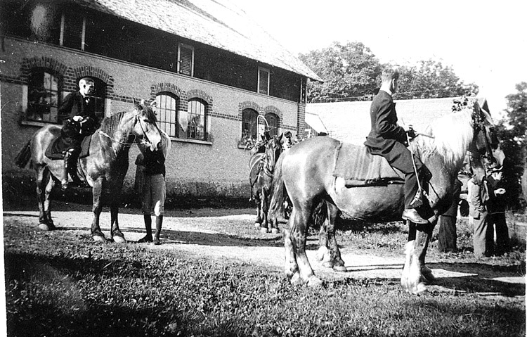 Brudgummen och prästen (Lars Anderås) på stallbacken norr om gårdens huvudbyggnader.