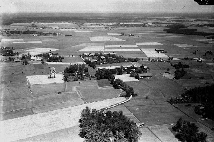 Titel: Flygfoto över Rinkaby, bostadshus och byggnader.