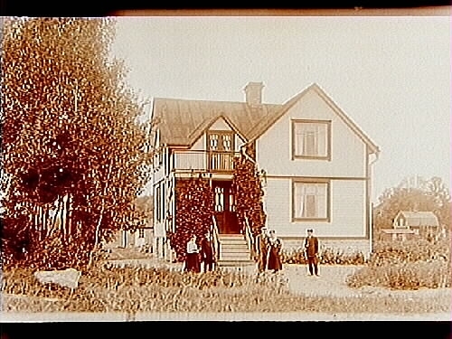 En och en halvvånings bostadshus med balkong och veranda, familj 5 personer framför huset.