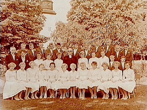 Konfirmander, 18 flickor, 15 pojkar och kyrkoherde Gunnar Johansson.