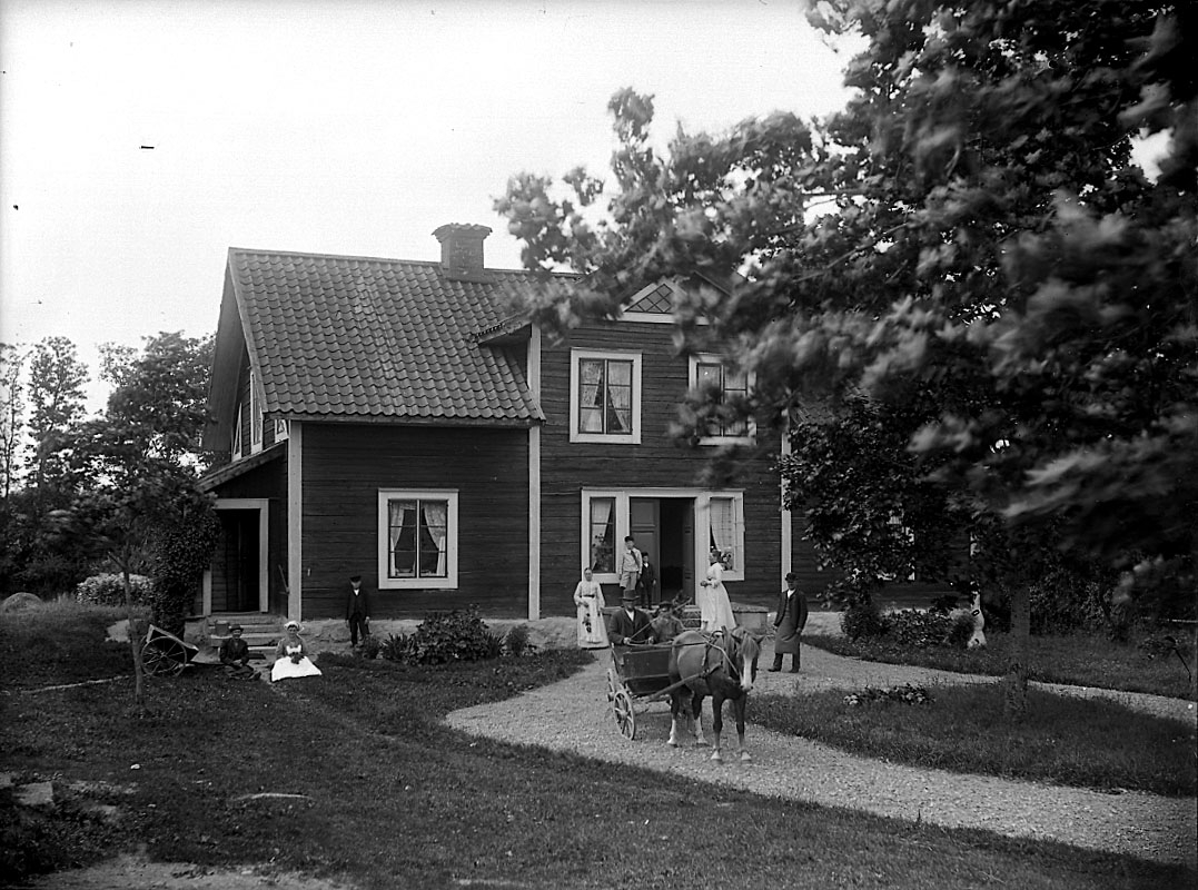 Bostadshus, grupp framför huset, häst och vagn, två personer i vagnen
