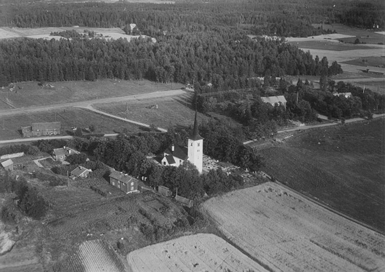 Flygfoto över Hovsta, med Hovsta kyrka.
