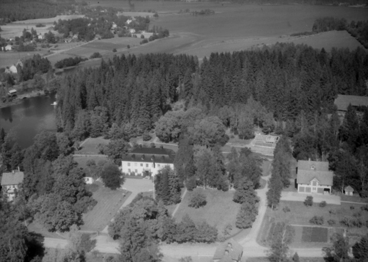 Flygfoto över Åmmebergs Herrgård, tvåvånings herrgårdsbyggnad och flygelbyggnader.