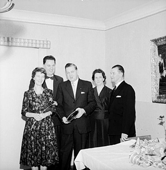 Brandkårens avskedsfest för Owe Carlsson, Ställdalen. Grupp fem personer.