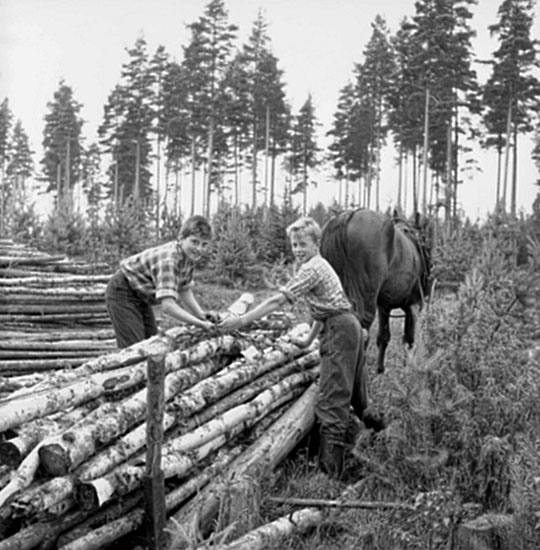 Lägret i Sikfors, timmerkörning med häst, två pojkar.