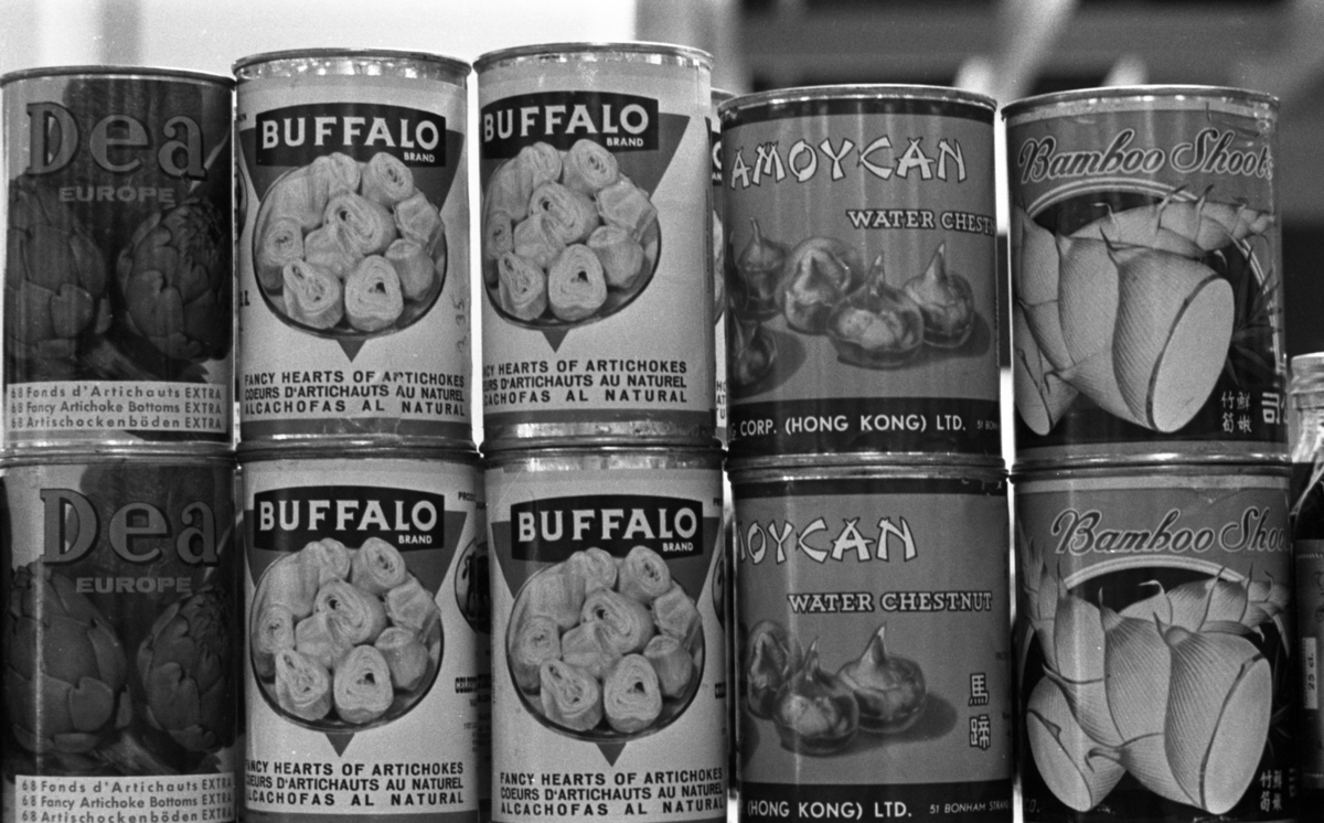 Ett antal konservburkar står på en hylla i en affär. De innehåller: kronärtskockor, vattenkastanjer och bambuskott bl.a.