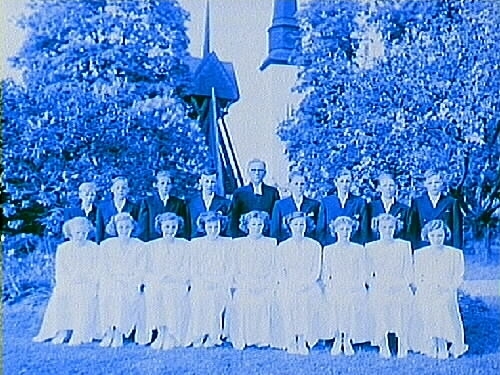 17 konfirmander, 9 flickor, 8 pojkar och kyrkoherde Johansson.