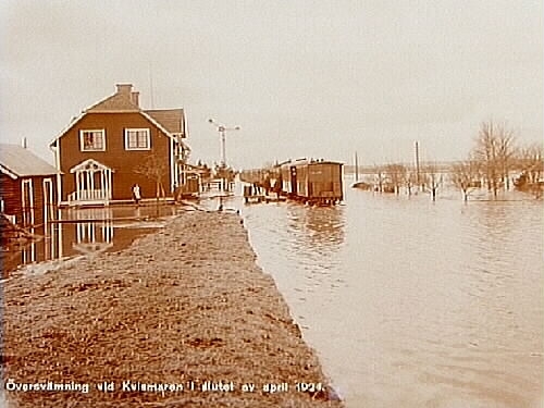 Kvismare järnvägsstation, tvåvånings stationsbyggnad. Järnvägståg på den översvämmade banvallen.