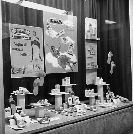Titel: Affärsbyggnad, skyltfönster, Scholls skor.