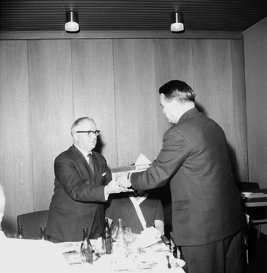 Rumsinteriör, grupp vid bordet. Personalklubben uppvaktar, Majgren avtackas.