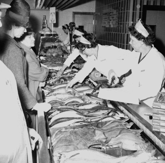 Konsum Domus, affärsinteriör, fiskdisken, kunder och personal.