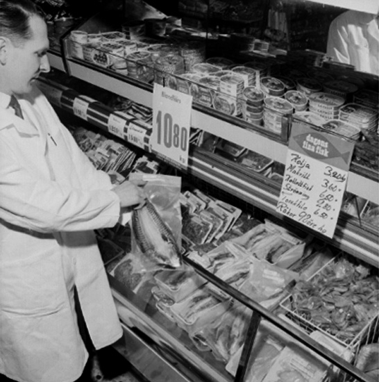 Konsum, affärsinteriör, fiskavdelningen, en man.