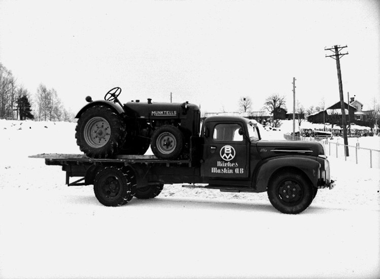 Titel: En lastbil och en traktor. Närkes Maskin AB, Örebro. Byggnadder i bakgrunden. Vintermotiv.