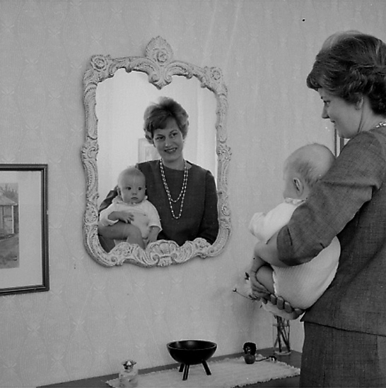 Rumsinteriör, en kvinna och en baby vid spegeln.