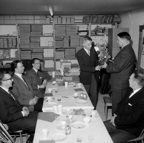 Rumsinteriör, grupp vid bordet, uppvaktning.