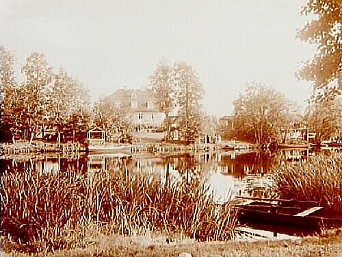 Tvåvånings bostadshus med frontespis, takkupor och brutet tak och trädgård vid Svartån.