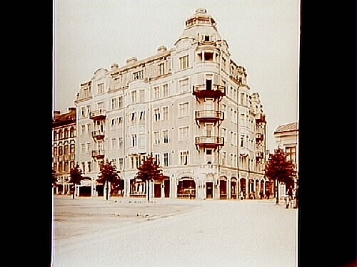 Stenhus i fem våningar med jugendpräglad fasad i beige och rosa slätputs.