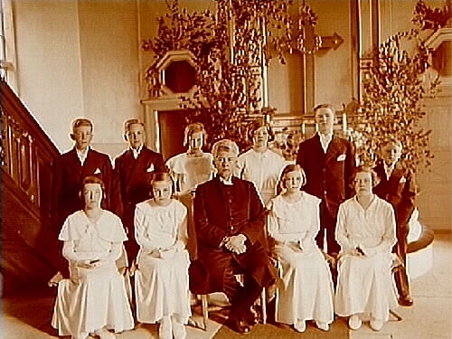 Konfirmander, 6 flickor, 4 pojkar och kyrkoherde B. Mellmström.