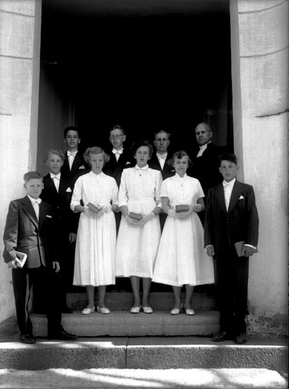 Konfirmander, tre flickor, sex pojkar och kyrkoherde Gösta Sköldebrand på kyrktrappan.