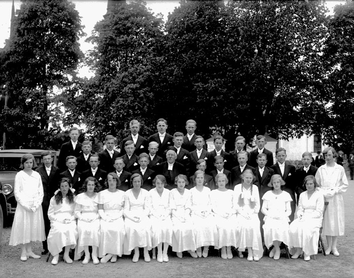 Konfirmander, 13 flickor, 24 pojkar och prästen.