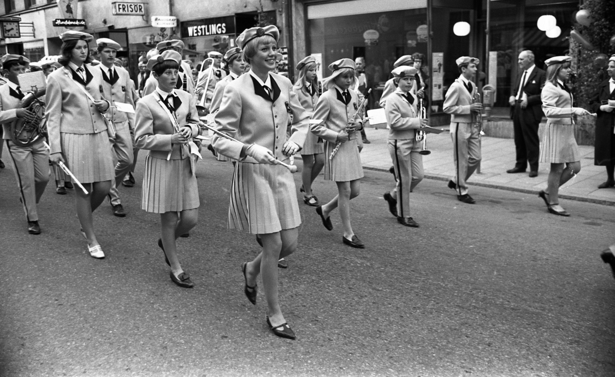 En orkester går gatan fram i centrala stan i Örebro. Den består av både kvinnor, män och ungdomar. Kvinnorna bär kavajer och kjolar och männen bär kavajer och byxor. En tamburmajor- en kvinna går framför gruppen med musikinstrument i händerna. Affärer och byggnader samt åskådare syns i bakgrunden.