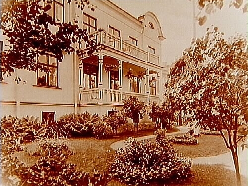 Trähus i två våningar med jugendpräglad fasad i gul slätputs, frontespis och två stora balkonger.