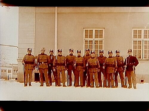 Soldatgrupp, 12 soldater utanför kasern.