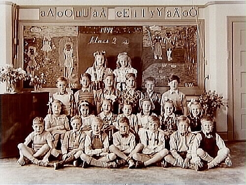 Engelbrektsskolan, klassrumsinteriör, 22 skolbarn med lärarinna fru Hilda Pettersson, klass 2Å, sal 8.