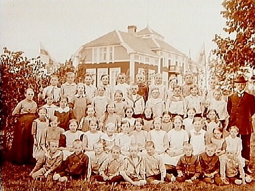 Talby skola, en och en halvplans skolbyggnad med frontespisar, balkong, brutet tak i tegel