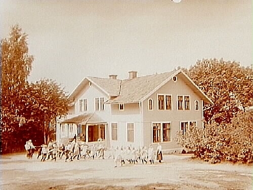 Glashyttans skola, en och en halvvånings skolbyggnad med frontespis och förstebro. Lekande barn utanför skolan.