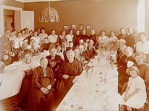 Titel: Rumsinteriör. Långt bord med födelsedagsbarn och gäster. Fröken Fina Forslund och Klara Karlsson på 50 årsdagen.