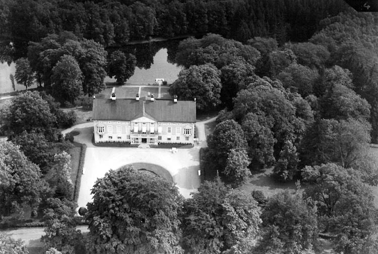 Flygfoto över Trystorps herrgård, tvåvånings herrgårdsbyggnad.