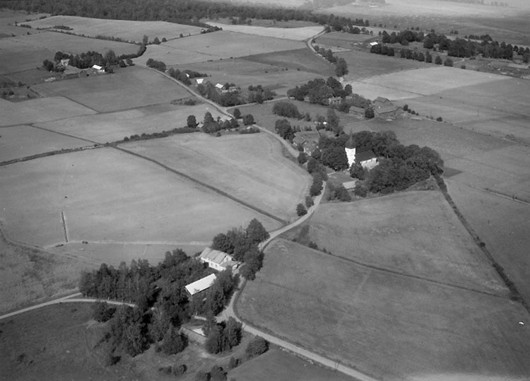 Flygfoto över Hackvad, kyrkan och bostadshus.
