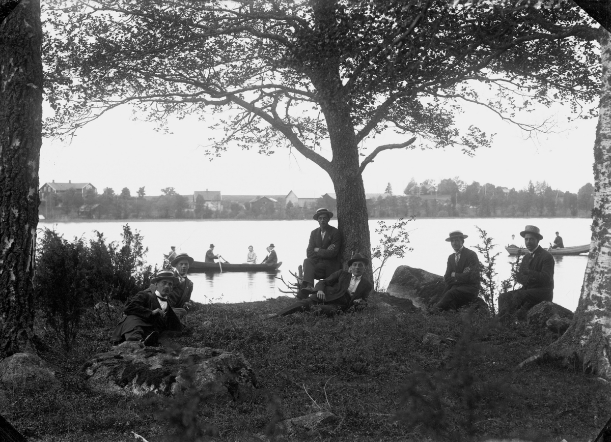 Sjöutsikt, grupp vid sjön, några personer i roddbåtar.