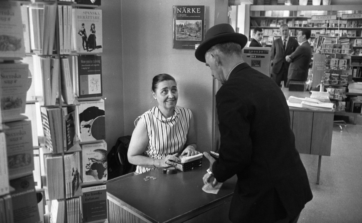 En herre klädd i kostym och hatt med ryggen mot kameran talar med en dam i randig ärmlös klänning som sitter vid ett bord och bläddrar i en kartotekslåda. Herrn håller en plånbok i vänster hand samt ett papper i sin högra hand. Till vänster står ställ med böcker i. Till höger i bakgrunden syns en kassaapparat samt tre herrar i kostymer som står längre bort i lokalen. Vid väggen syns flera bokhyllor fulla med böcker.