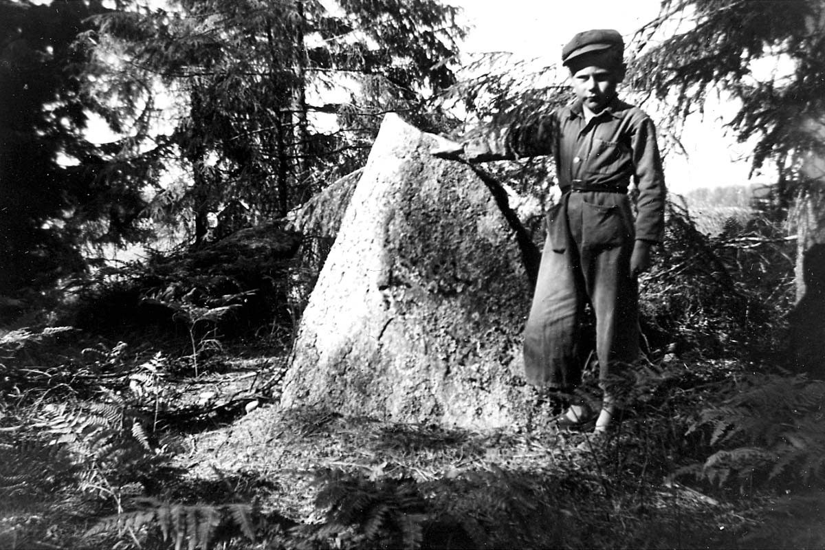 Domarring vid Segolstorp, en av stenarna. En pojke bredvid.