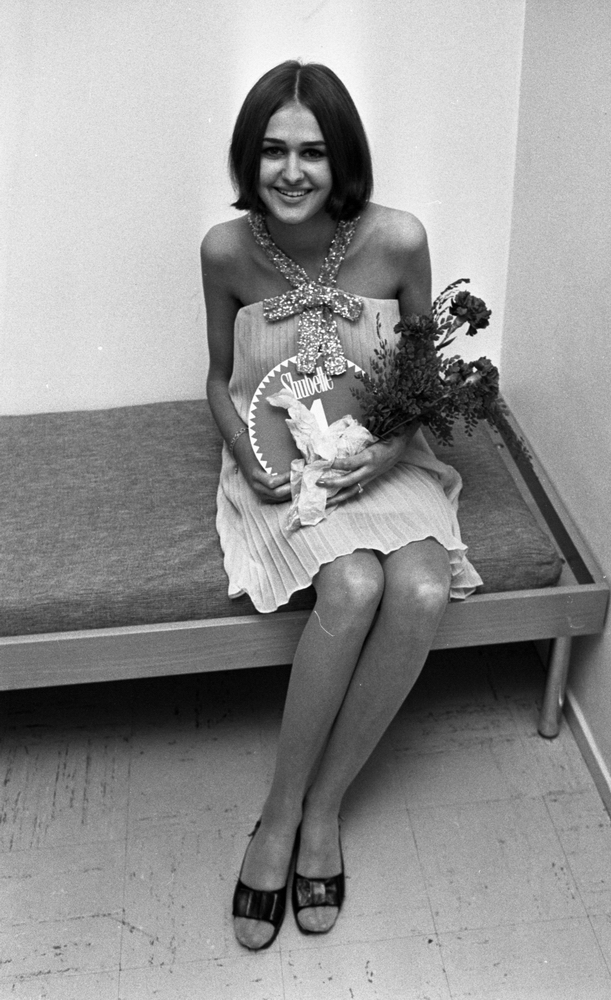 En fotomodell sitter på en säng och håller i en blombukett samt en skylt. Hon är klädd i en lårkort, vit klänning med en silverrosett framtill och ett snöre som löper från denna runt hennes hals. På fötterna har hon svarta lågklackade skor.