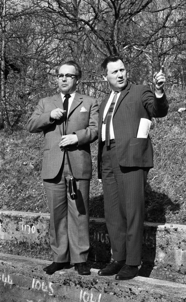 Dragspelsmusikern Gnesta-Kalle i mörkrandig kostym, vit skjorta och ljusrandig slips står bredvid radiomannen Carl-Uno Sjöblom klädd i ljus kostym, vit skjorta och svart slips. Gnesta-Kalle har en hoprullat häfte i vänster kostymficka och Carl-Uno Sjöblom håller i en liten svart väska och har glasögon. De befinner sig nära Riseberga klosterruin.