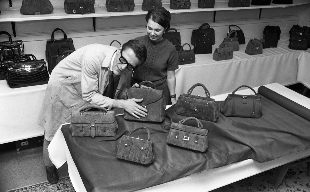 En man klädd i vit arbetsrock, vit skjorta, svart slips, ljusa byxor, glasögon och mörka skor står framåtlutad över ett bord fyllt där det står sex handväskor. Han håller i en av dem. Bakom honom står en kvinna klädd i mörk, kortärmad, stickad tröja och mörk kjol. Hon har örhängen i öronen. Fler handväskor står uppställda på hyllor i bakgrunden.