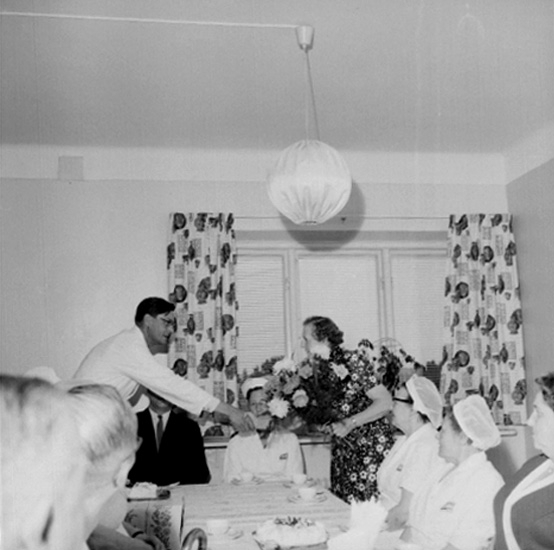 Titel: Rumsinteriör, grupp vid bordet, Kexens pensionärer. Personalklubben uppvaktar. Örebro Kexfabrik.