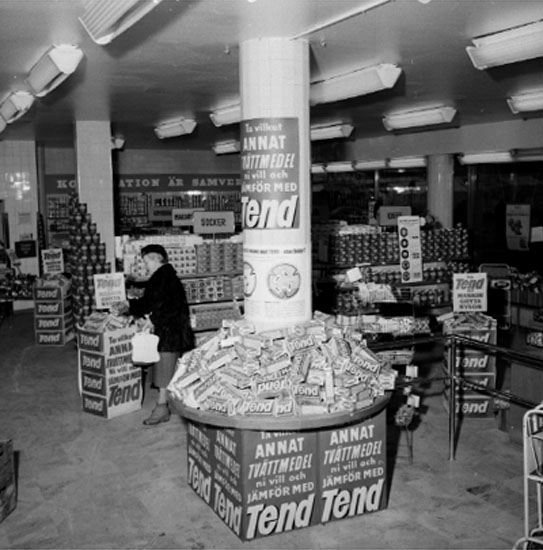 Konsum, affärsinteriör, tvättmedel Tend, en kvinna.