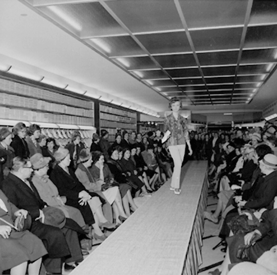 Oscarias nya affär, skoaffärsinteriör, modevisning.