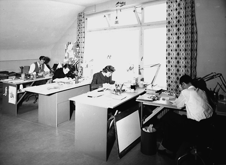 Ateljéinteriör, tre personer (en av landets modernaste ateljéer).