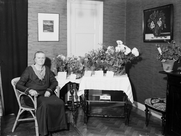 Titel: Rumsinteriör, en kvinna. Fru Spångman på födelsedagen.