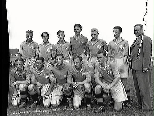 Svenska B-landslaget (fotboll), som vann över Norge med 4-2 på Eyravallen 1939. Fr.v. stående Gunnar Gren. Olle Carlberg, 'Bian' Rosengren, Olle Hultfeldt, Erik 'Diman' Lindström, 'Tjoffe' Ohlson och Thure Claesson (lagledare). På knä fr.v. Gillis Andersson, Ivar Arvidsson, Torsten Lindberg, Erik Lundin och Sture Andersson.