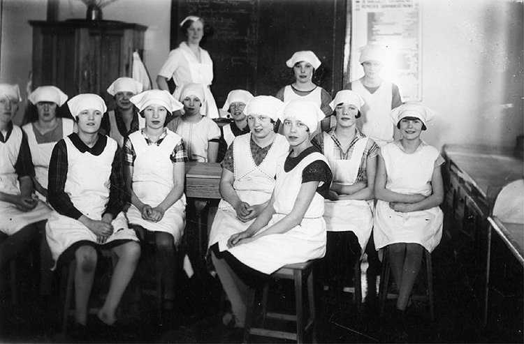 Skolkökskurs, grupp 13 flickor med lärarinna.