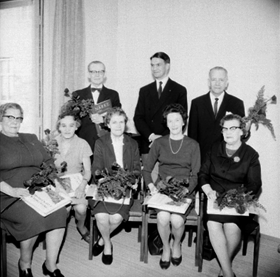 Rumsinteriör, grupp 8 personer, Kexens pensionärer. Personalklubben uppvaktar.