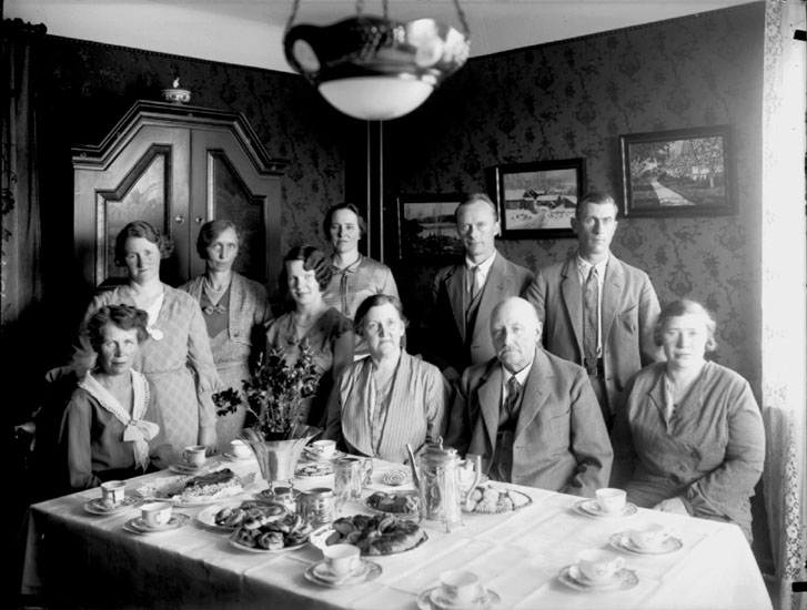 Rumsinteriör, familjegrupp 10 personer vid kaffebordet.